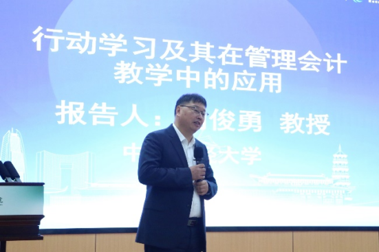 中央财经大学刘俊勇教授分享的主题是《行动学习及其在管理会计教学中的应用》。首先,刘俊勇教授向我们介绍了行动学习的六个基本要素并指出了目前行动学习在全国高校和企业单位的推进情况。他中央财经大学MPAcc入学的第一课为例,为我们讲解奥云教学法是如何将行动学习和云班课有机结合起来。他着重指出云班课可以通过提问、小组研讨及课堂展示、团队共创、总结反思等环节来展开。其中团队共创是非常有必要创建小组群,然后分组讲解了管理会计模型图。刘俊勇教授认为这种方法不仅可以培养学生的团队意识,也可以实现课堂以学生交流为中心的当代教育目标,从而激发众多学生的散发性思维,挖掘学生身上更多未知的潜能。