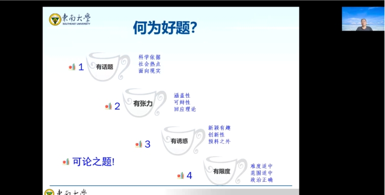 关于应该如何去选择科研题目,陈教授以亲身经历为引,从“从读书和讨论中发现问题”“突破学科空白处及交叉口”“综合、比较与社会调查”“移植与怀疑”“换位思考”“实践中找选题、政策中找选题”六个大方面向同学们进行了详细讲解。
