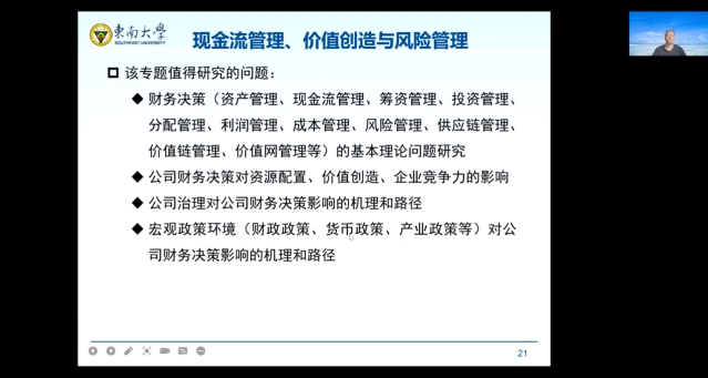 随后,陈教授结合国家政策向同学们介绍了现金流管理、价值创造与风险管理以及内部控制理论与方法研究相关领域未来有可能研究的方向。他指出,会计研究应该面向国家发展战略和经济社会发展重要需求,到实践一线去学习真知灼见;关注实践和关注经济社会的发展是会计专业学习和研究需要非常重点关注的关键。