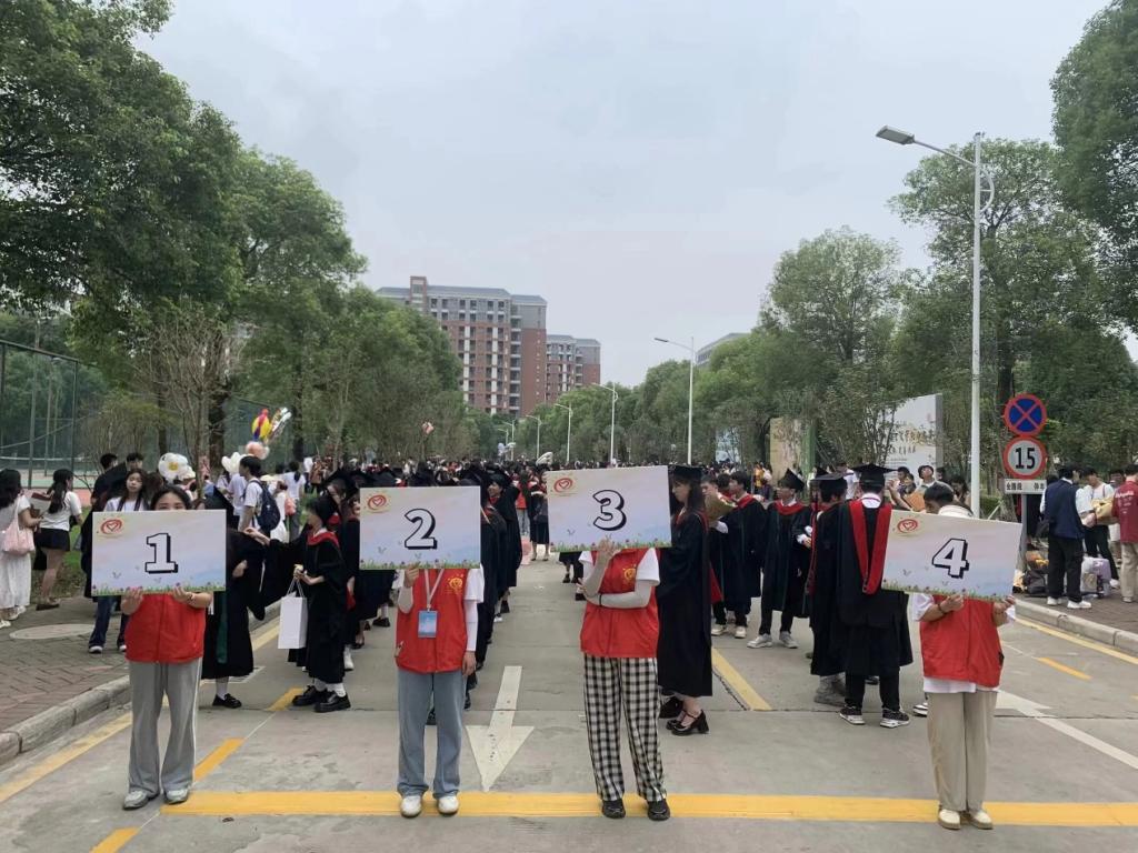 五月初,阳光和煦,校园洋溢着毕业的喜悦。活动当天,在中山像的志愿者身着红色马甲,忙碌而有序,他们手持指示牌,指挥毕业生们井然有序地排成五排,确保班级队伍整齐地走向中山像,为毕业照的拍摄做好准备;在体育馆的志愿者手持着写有毕业班级名称的小黑板,维护着候场区的秩序,确保每个班级的毕业生们顺利排队、准时上场,并耐心指引他们有序前往馆口进行拍摄,留下难忘的毕业瞬间。志愿者们的辛勤付出不仅解决了毕业生的需求、为这次毕业照拍摄工作提供了极大的便利,更展现了志愿者们的责任与担当。