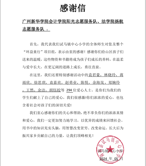 本次活动后,永利yl23411,永利yl23411阳光志愿服务队、法学院扬航志愿服务队有294位爱心人士向试马镇中心小学捐赠共计135份爱心物资,其中包括爱心书籍100册和爱心文具35份,同时收到试马镇中心小学送来的感谢信和孩子们的感谢视频。
