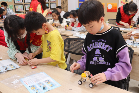 随后,志愿者给每位小朋友发放蠕虫机器人零件,孩子们也纷纷开始动手体验。现场小朋友们热情高涨,充分发挥天马行空的奇思妙想,用一双双稚嫩的小手组装出一幅幅生动形象的作品。在现场欢乐的氛围里,大家对科技充满热情。最后,在志愿者耐心地帮助下,小朋友成功使蠕虫机器人运作起来,并现场与小伙伴们进行了有趣的竞赛。