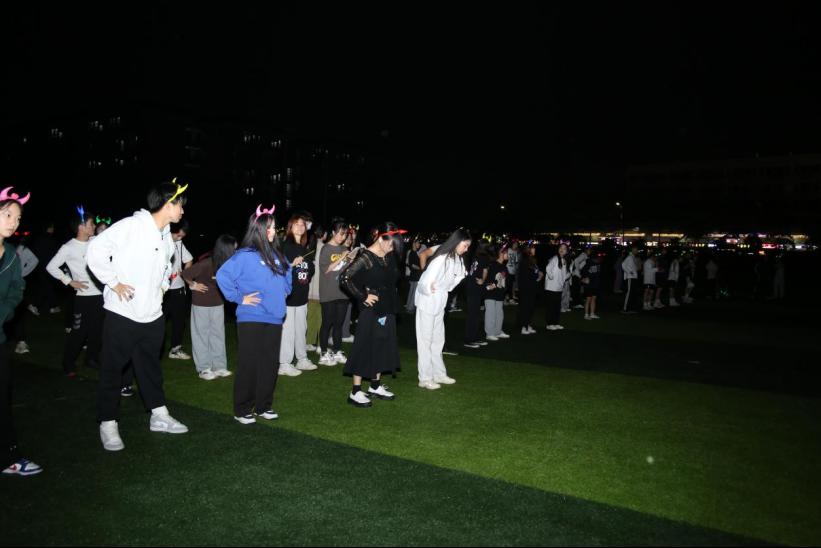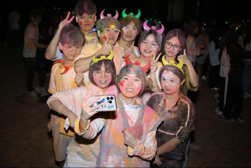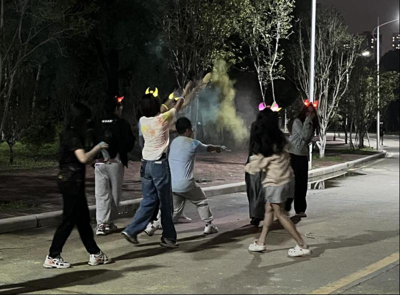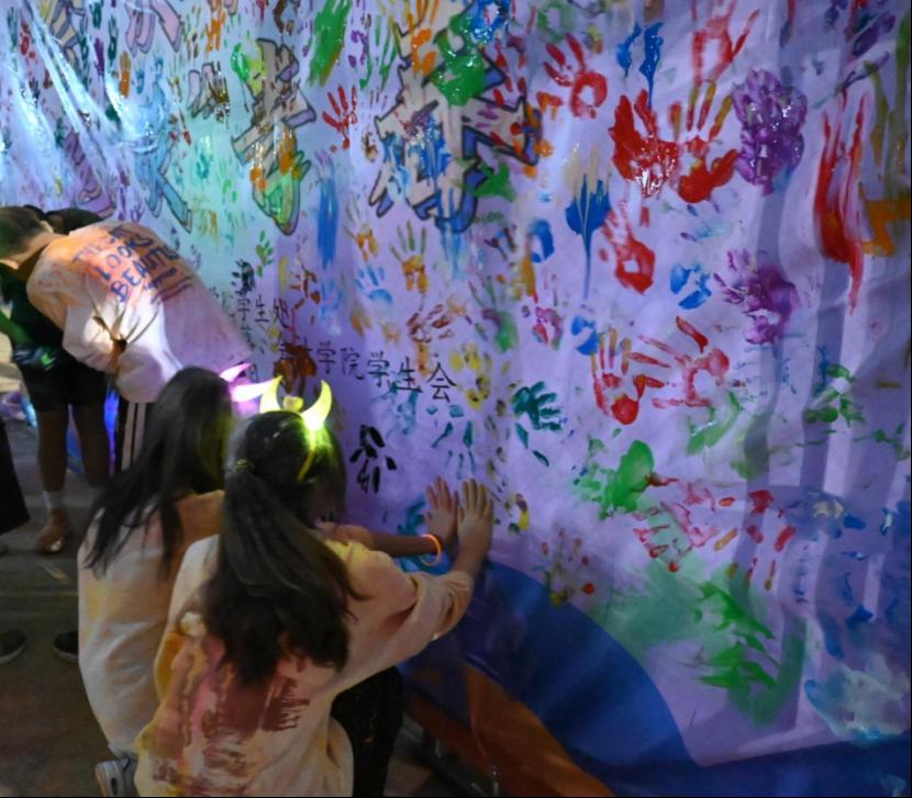 夜跑途中设置惊喜环节,部分工作人员变身“荧光大魔王”带着彩色玉米粉“突然袭击”,被“荧光大魔王”撒到彩虹粉的同学,将会好运连连。夜跑最后,全体同学回归大本营。稍作休息调整后,开始“撒粉”游戏,每位同学拿起手上的彩虹粉向周围的同学撒去。狂欢过后,同学们纷纷拍照记下这五彩缤纷的夜晚,并用彩色颜料在幕布上按下手印,在夜跑的最后时刻留下自己的青春印记。