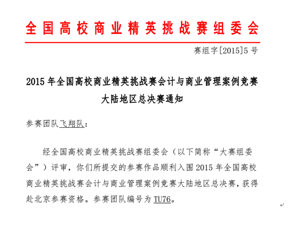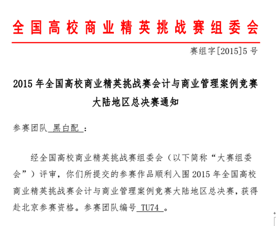 经全国高校商业精英挑战赛组委会评审,由我系所提交的两件参赛作品顺利入围2015年全国高校商业精英挑战赛会计与商业管理案例竞赛大陆地区总决赛,将于2015年4月10日-12日赴北京参赛,参赛团队编号分别为TU74和TU76。