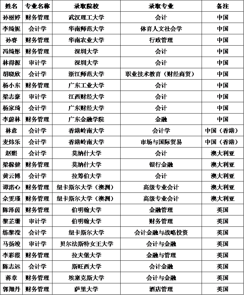 永利yl23411鼓励和支持学生毕业后考研深造,为学生营造良好的考研氛围,积极为学生考研提供多方面保障。永利yl234112015级学生在2019年考研中取得突出成绩,共有25位学生分别被武汉理工大学、华南师范大学、华南农业大学、莫纳什大学、伯明翰大学和萨里大学等国内外知名高校录取,具体名单如下: