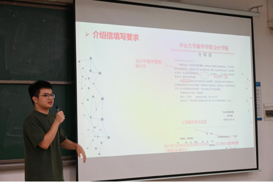 随后,教学秘书陈桂昌老师上台讲解了实习中介绍信填写、实习周记记录、实习资料提交等事项的具体操作流程以及本科生实习报告书的书写规范。