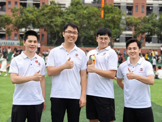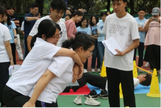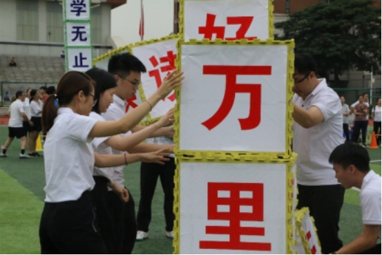 下午的趣味项目和4x100m混合接力决赛也进行得如火如荼。趣味项目包括螃蟹背西瓜、聚沙成塔和指压板冲关三轮游戏。虽然比赛项目繁多,体力的消耗让老师们有些疲惫,但大家依旧乐在其中。