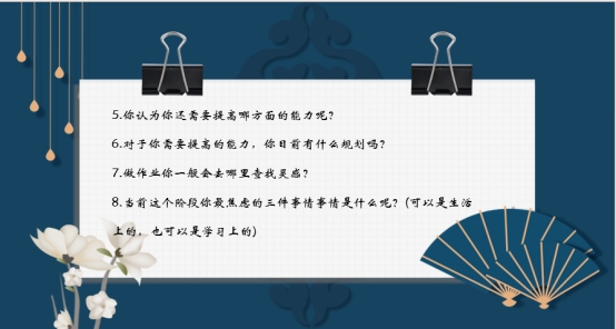 接着,为了增强班级凝聚力,帮助同学们更好地规划未来的大学生活。班主任丁佳佳老师和同学们积极互动,一起思考以下8个问题,给了同学们努力的方向。