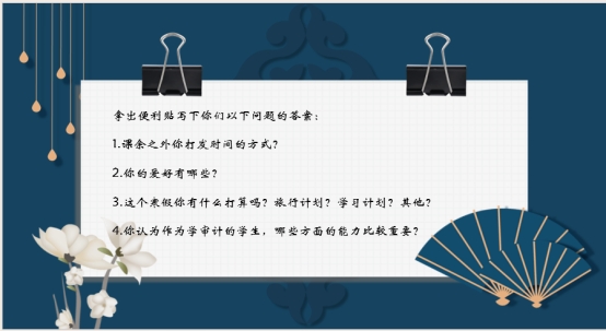 为进一步加强班级建设与管理,引导学生进行有意义的大学生活,永利yl2341122级审计学A班于11月14日在定静楼1D302教室召开审计专业主题班会,本次班会主题为“争分夺秒备战期末,居安思危规划未来”,由班主任丁佳佳老师主持,22级审计A班全体同学参加。