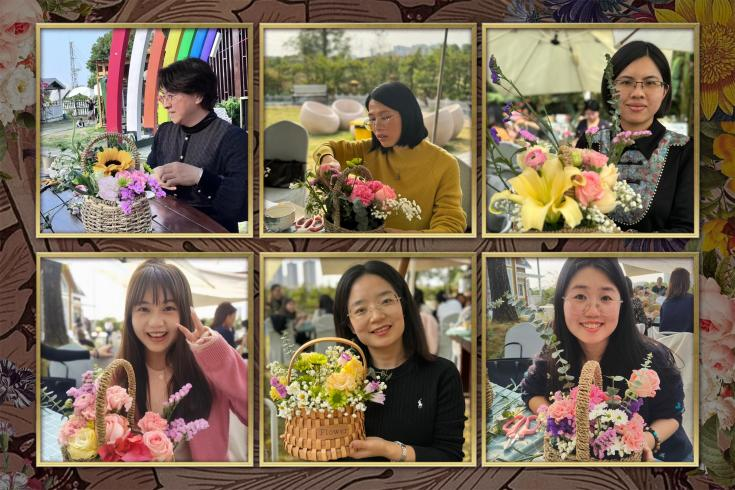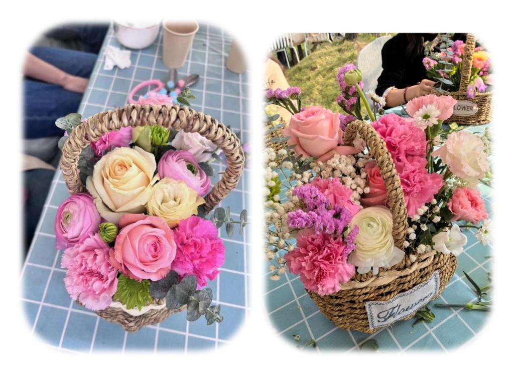 活动现场,工会特邀了专业的花艺师进行现场教学,老师们积极参与,边学边练,将手中的花材、绿植进行修剪、整枝,依据个人的艺术美感和色彩搭配,运用智慧和巧手创造出一件件各具特色的插花艺术作品,并用镜头定格下这一份专注而美丽的画面。一篮篮精致的花束编织成了一幅幅动人的画卷,给参与活动的老师们带来了无比的喜悦。