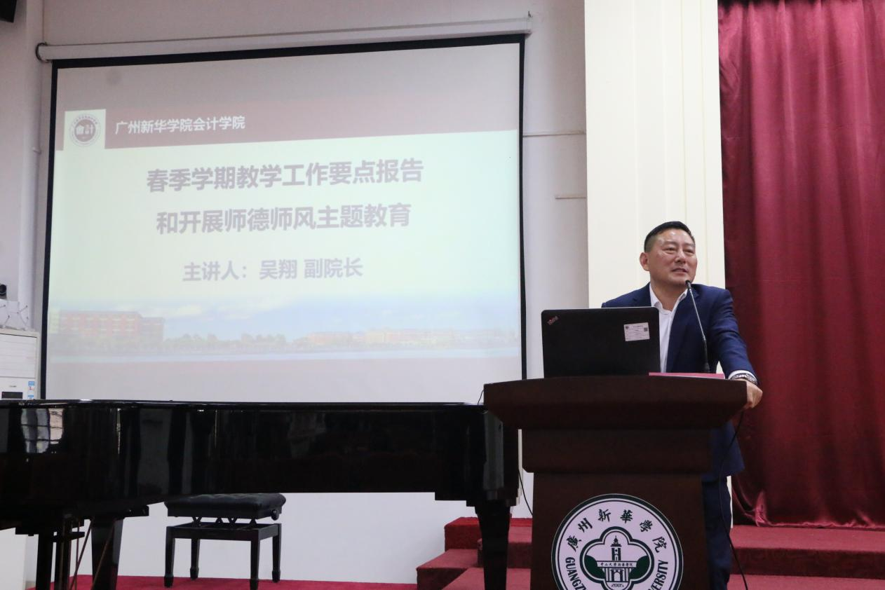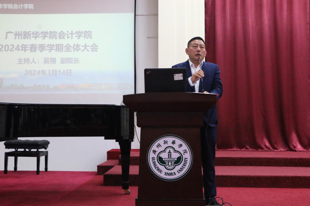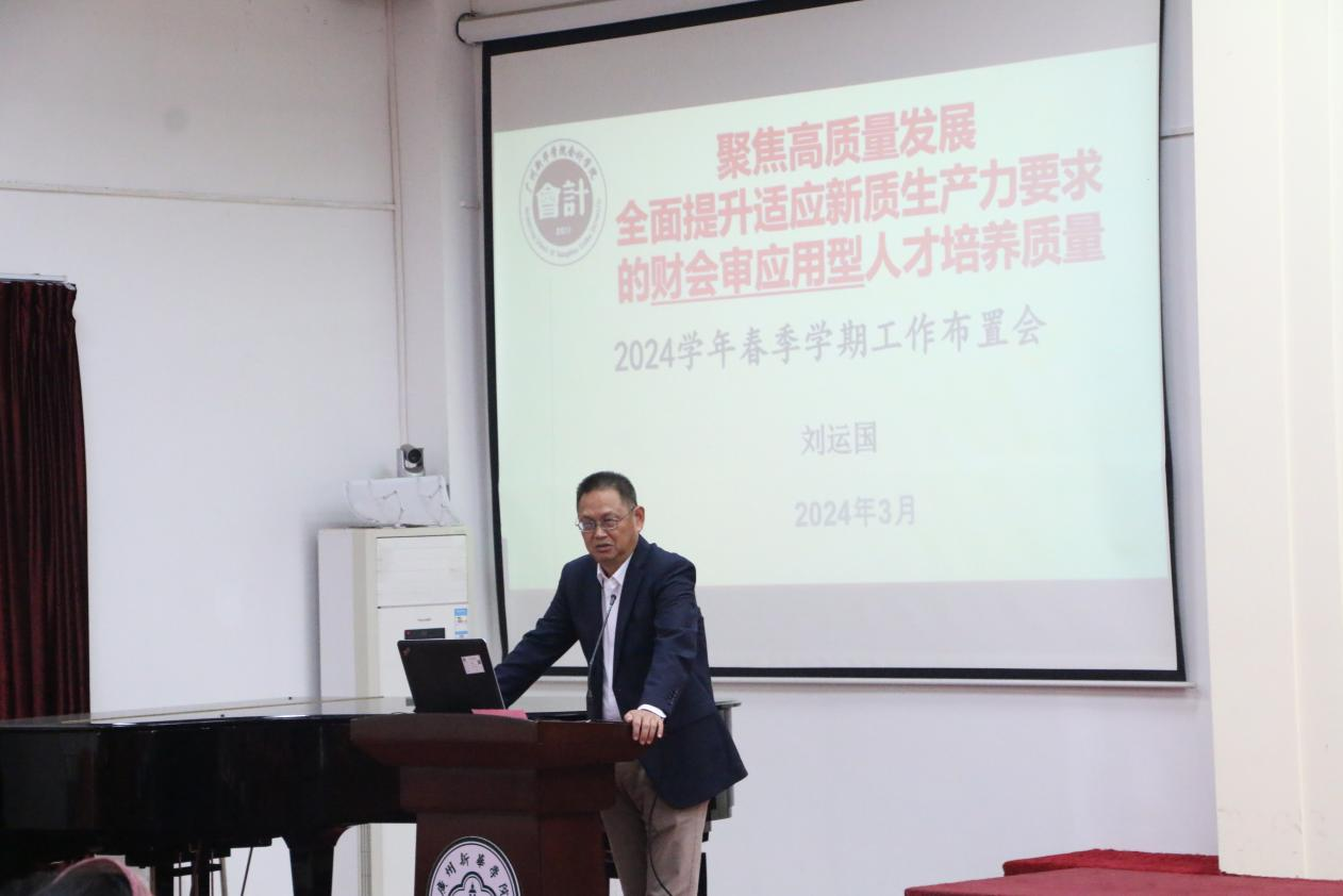 接下来,刘运国院长就春季学期工作部署发表了主题讲话。他强调新华学院作为一所应用型高校,应致力于提升“财会审”应用型人才的高质量培养,紧密贴合新质生产力的需求。刘院长同时传达了全国教育工作“七项重点任务”和广东省教育厅提出的“八大工程精神”,详细阐述了永利yl23411新学期的工作思路与要点。他表示,我们要紧跟国家政策导向,深入践行党的二十大精神,坚持“立德树人、三全育人、五育并举”理念,紧扣“学术强校、质量立校、特色兴校、开放办校”的发展战略。针对工作要点,刘院长明确指出,新学期要紧密围绕“合格评估、一流专业建设、硕士点建设”三大核心任务进行攻坚,坚守本科教育高质量的生命线,持续推进教育教学综合改革。此外,他还对师资队伍建设、日常教学管理、科研教研、社会服务及学院文化建设等工作提出一系列举措和要求,力求永利yl23411在新一年里各方面工作再上一个新台阶。