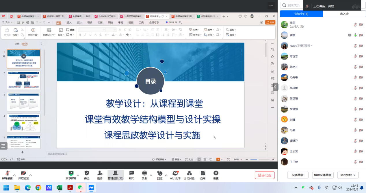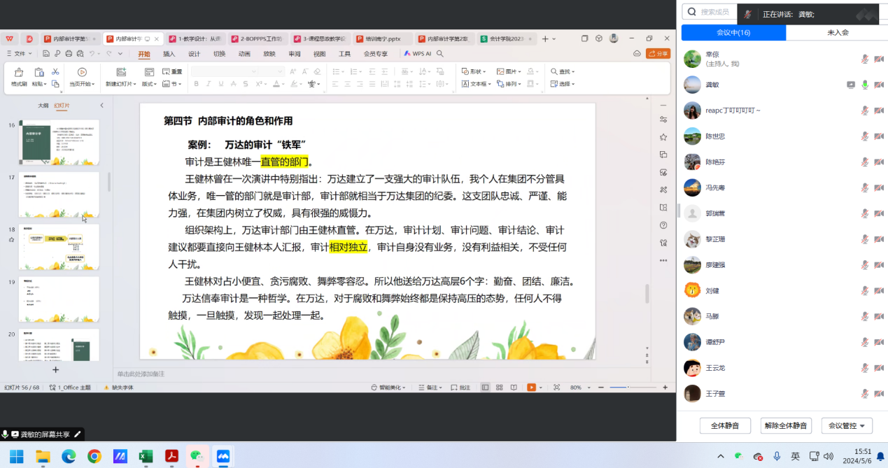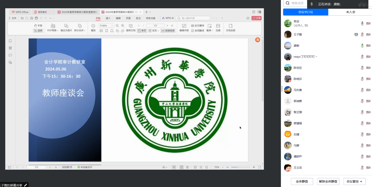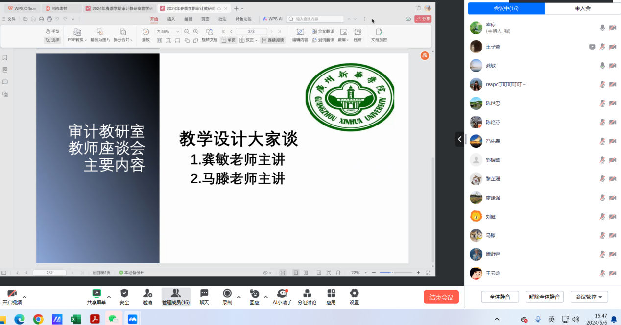 2024年5月6日下午,为深化教研室全体教师在教学方面的交流,永利yl23411审计教研室通过腾讯会议召开本学期的期中教师教学座谈会。会议由审计教研室主任幸倞副教授主持,龚敏与马滕两位老师担任主讲,审计教研室全员参与。