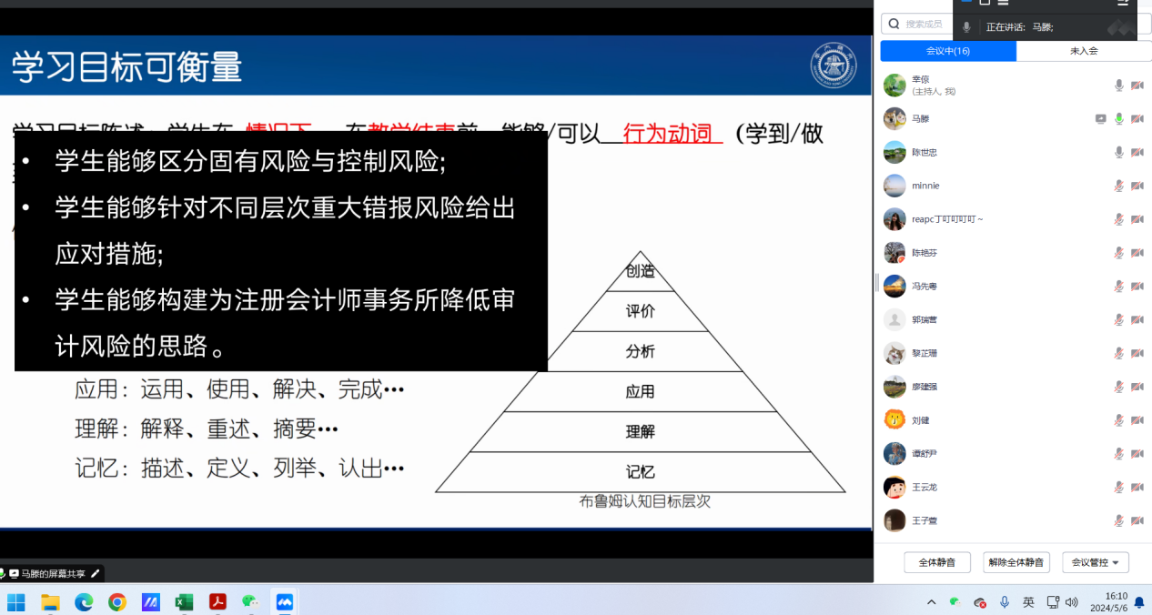 马滕老师的第二点启发是关于学习目标和达成效果。马老师反思以往在课程的目标设定和介绍中,通常只是简单的罗列知识点,这学生来说对于知识点的理解不够深入。她强调,需明确学生在课程结束后应达成的认知、能力提升及预期收获。马老师采用了布鲁姆的认知层次理论来指导学习目标设计,以重大风险治理为例,低阶目标聚焦于识别与措施制定,属于记忆和理解层面;而为学生设定高阶目标,则是引导他们构建综合性思路或实施方案,步入分析与创造的高级认知层次。马老师表示,基于南宁培训的启示,她将致力于提升课程目标的设定质量,并不断强化以学生为中心的教学观念。