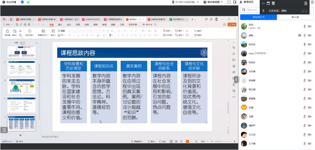 在分享如何将思政元素融入课程时,龚敏老师提出了几个建议。一是结合学科背景、发展历程及其在国家与社会中的作用,强调课程学习的重要性。二是知识点融入哲学思想、科学精神和道德规范等深层次内容。三是通过真实案例教学,如龚老师分享自己亲历的世通案例,展示内部审计负责人如何坚守职业道德,解决伦理困境,揭示财务造假,强调关键时刻的道德决策力。四是关注课程与社会应用的紧密联系,尤其是前沿热点问题。五是融入中国特色社会主义文化,增强民族文化自信和文化认同,如龚老师在内部审计课程中的实践。