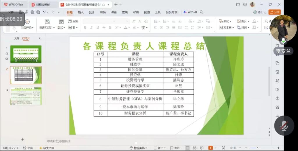 会议第一个环节是各位课程负责人进行课程总结,首先是财务管理课程负责人许彩玲老师发言,其分享了财务管理课程组教学中的成功经验,虽然财务管理课程存在内容庞杂、公式繁多等痛点难点,但是通过线上线下混合式教学如正保云系统的应用,各种别开生面、寓教于实战的案例分析取得了学生们的一致好评和热烈响应。其次国际金融、投资银行学的课程负责人熊诗忠老师也分享了课程教学中存在的诸多问题以及挑战,即国际金融课程面向的审计学专业的学生需要教学过程中重视汇率的实际应用和换算,投资银行学面对的会计学的学生强调投资银行和商业银行业务的对比,虽然学生基础参差不齐、课程体系设置不合理,熊诗忠老师还是凭借其专业能力赢得了学生的一致好评。