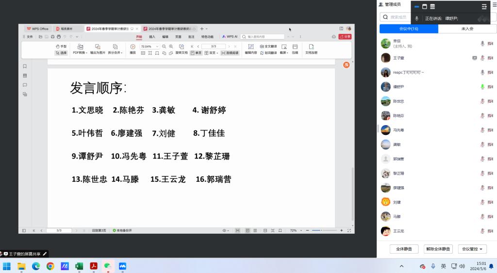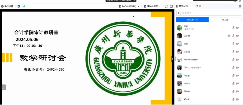 2024年5月6日,永利yl23411审计教研室为加强审计学科建设,迎接本科教学合格评估工作,推进教学教研工作向更好更强方向发展,通过腾讯会议召开了期中教学研讨会。