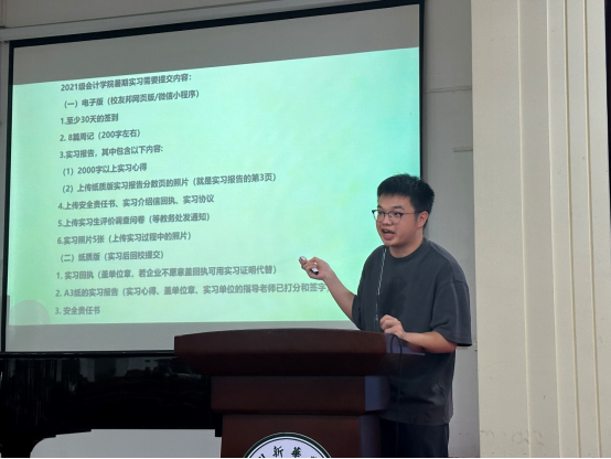 随后,教学秘书陈桂昌老师详细介绍了实习的具体要求,包括实习时间、实习成绩评定、实习资料提交等。学生需要提交实习介绍信、安全责任书、实习报告书等资料等,并按要求完成校友邦APP上的签到、周记和照片上传等任务。