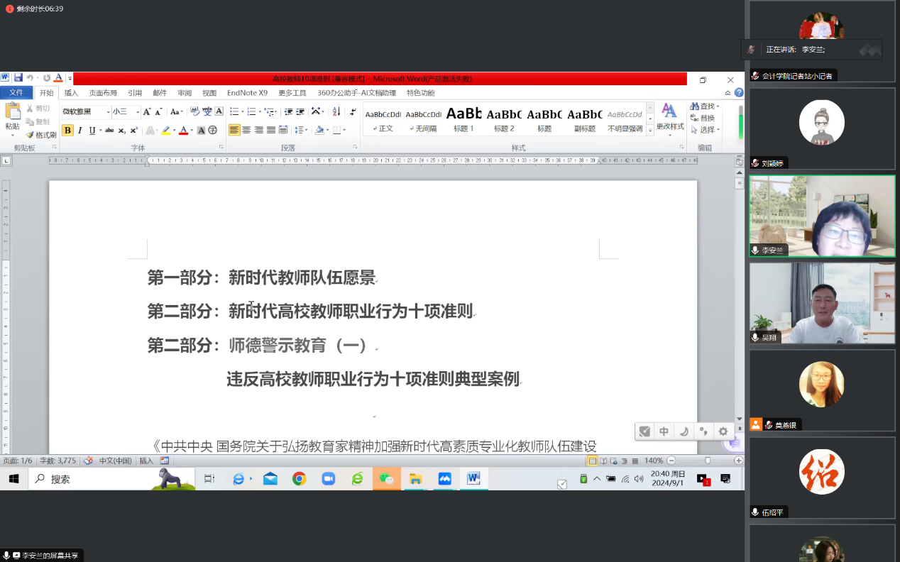 新学期,新气象,新风貌,永利yl23411,永利yl23411(以下简称“永利yl23411”)在新学期迎来一批优秀教师。为帮助与指导新入职教师更快速适应教学工作、提升教师教学水平、融入永利yl23411大家庭,永利yl23411于2024年9月1日晚召开了2024年新入职教师线上培训会议。学院院长刘运国教授、副院长兼党总书记李安兰教授、副院长吴翔教授、各专业教研室主任及新入职教师参加了本次培训会议。本次会议由副院长吴翔教授主持。