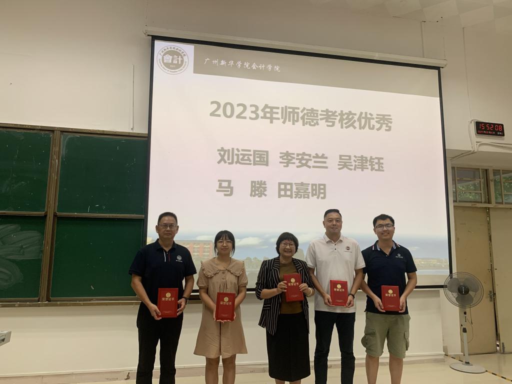 为表彰师德榜样,会议还为2023年师德考核优秀的老师进行了颁奖,以肯定他们在教育教学中的高尚品德与无私奉献精神,获奖人员包括刘运国、李安兰、吴津钰、马滕和田嘉明。这些教师以其严谨治学的态度、关爱学生的热忱以及在日常工作中展现出的高度责任感,赢得了师生们的广泛尊敬与爱戴。他们的事迹不仅为学院树立了良好的道德标杆,也为广大教师提供了学习的典范,进一步推动了学院师德师风建设的深入开展。