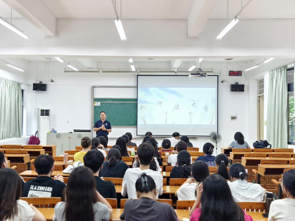 随后,刘运国院长以《如何读大学》为主题,分享了一系列宝贵的见解与经验。他引用苏东坡的故事,讲述了其在不同境遇下仍保持积极态度,坚持不懈追求学问的精神,以此激励同学们无论面临何种挑战都应保持乐观,努力学习,自我提升。刘院长特别强调了“两馆”——图书馆和体育馆的重要性,倡导学生们多读书、多运动,既增长知识又保持健康体魄。他还指出,大学不仅是获取专业知识的场所,更是个人成长与社会实践的关键平台。刘院长鼓励学生们积极投身学术研究和社会实践活动,全面提高个人能力,为未来职业生涯奠定坚实基础。