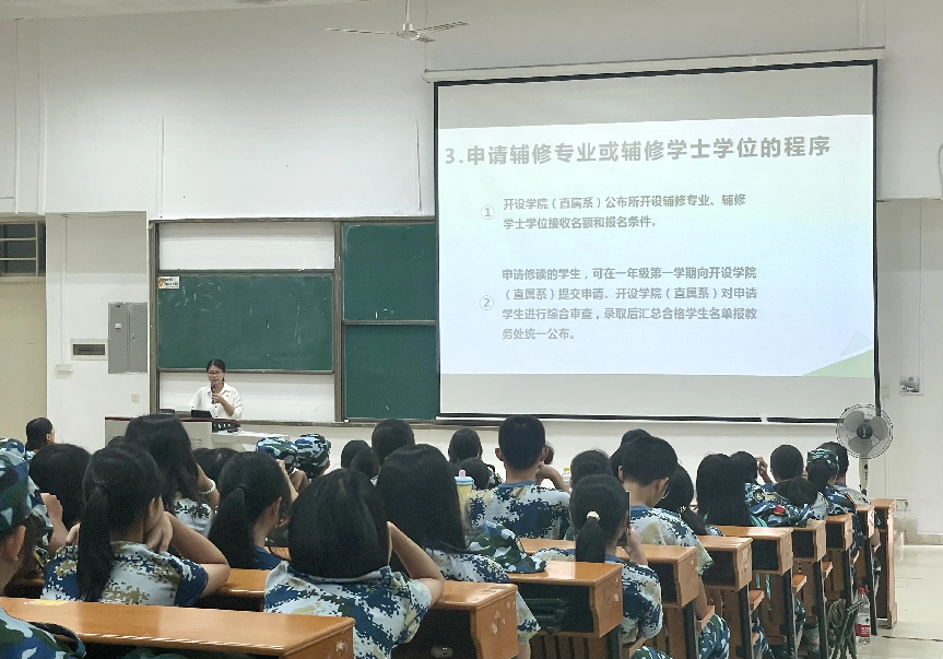 在教学管理说明环节,由教务老师系统地讲解学院的教学管理体系,涵盖了本科教学的主要内容、课程与学分、学制与学习年限、课程修读、课程考核与成绩记载、重缓考、重修、辅修专业和辅修学士学位、考勤、奖励与处分、毕业、学士学位的授予等方面。教务老师着重阐述了学分制的核心价值,建议学生们依据个人职业规划灵活选课,确保高效完成学业目标。