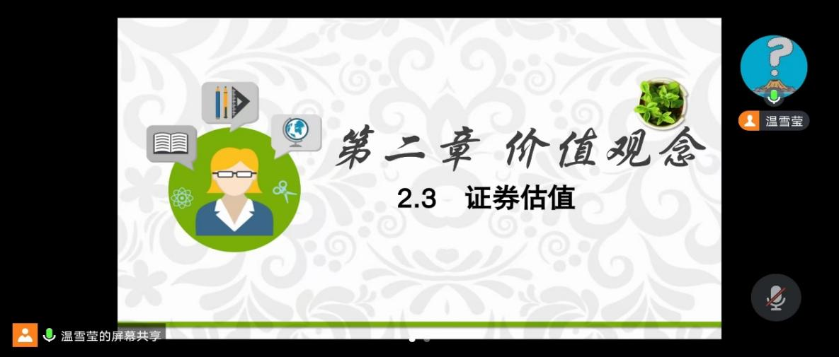 会议首先是财务管理教学团队新晋教师温雪莹试讲。她以财务管理第二章—证券估值为主题,进行了15分钟精彩试讲。温老师以其细致入微、声情并茂的讲解,将债券估值的相关内容娓娓道来,为会议拉开了序幕。