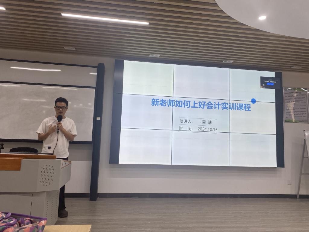 随后,黄靖老师就“新老师如何上好会计实训课程”进行了专题讲座。黄靖老师分享了课程设计、教学方法、学生互动、评价反馈等方面的经验,并特别强调了学习通平台在教学中的应用。他详细介绍了如何通过学习通发布课程资料、布置作业、进行在线测试和反馈,以及如何利用平台的数据分析功能来跟踪学生的学习进度和效果。