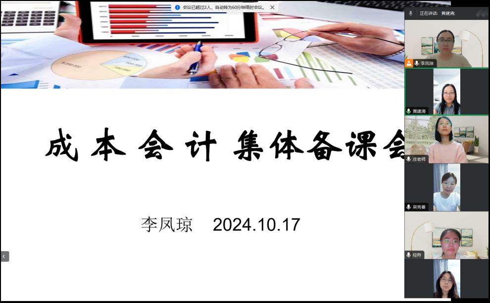 2024 年 10 月 17 日晚,会计系成本会计课程组借助腾讯会议召开了集体备课讨论会。会议由课程负责人李凤琼老师主持,会计系庄婉婷副主任、吴秀曼、黄建清、经羚、刘靓等老师共同参与。本次备课会聚焦成本会计课程的教学情况及课程建设安排,旨在提升成本会计课程的教学质量,明确课程建设方向。