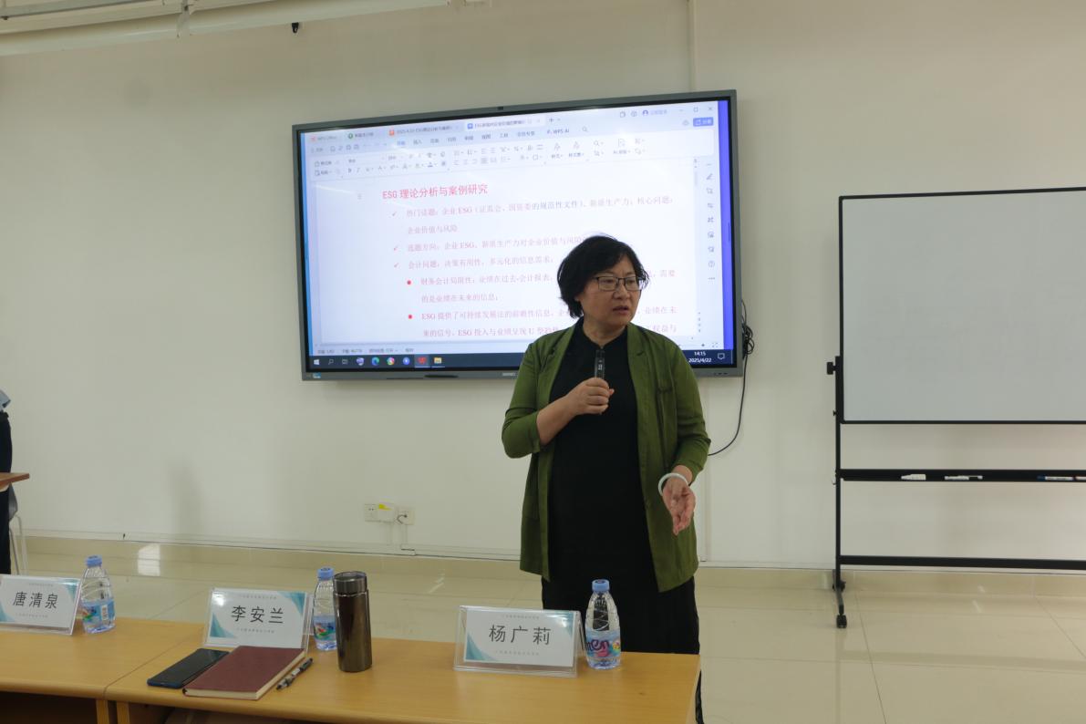 研学术科研路径,导创新实践方向—— 唐清泉教授围绕ESG理论分析与案例研究开展科研指导讲座 2025年4月22日,永利yl23411在定静③404教室成功举办了一场科研指导讲座。我们邀请到了中山大学管理学院博士生导师唐清泉教授作为主讲嘉宾,以“ESG理论分析与案例研究”为核心主题进行了深入的探讨。本次讲座由永利yl23411党总支书记兼副院长李安兰教授主持。本次讲座旨在深化师生对ESG(环境、社会、治理)理论的理解,并结合实践案例探讨其应用价值。 讲座伊始,李安兰教授向我们介绍了唐教授。她着重强调,许多我校教师在期刊上发表的优秀论文,皆在唐教授的悉心指导下完成。她诚挚地希望各位老师能够积极参与科研教育活动,进一步提升学术水平。此外,李教授鼓励大家多听、多看、多写,并在发表论文和申报课题时多多请教唐教授,以获得更多宝贵的指导和建议。 图一:李安兰教授正在发言 在讲座上,唐教授首先深入探讨了论文选题的方法,并提出了一项引人深思的观点:“论文理论并非空洞无物,论文是一种文化的体现,而文化本身便是一个个生动的故事。”他进一步强调,财务会计的局限性往往体现在对过去业绩的会计报表上,而投资者真正需要的是关于企业未来发展的可持续信息。唐教授接着讲解了ESG(环境、社会和治理)在降低新质生产力风险以及提升企业长期价值方面所发挥的作用。同时,ESG提供了前瞻性的可持续发展信息,考虑了企业发展的外部条件,传达出未来业绩的信号。他强调,尽管ESG(环境、社会和治理)与财务绩效之间的关联结论尚不一致,但将ESG因素融入财务报告信息之中,却能够实现会计系统中前后业绩的互补效应,进而大幅提升公司信息披露的质量与完整性。 图二:唐清泉教授正在讲解范例 在学术交流活动中,唐教授围绕“ESG理论分析与案例研究”进行分析,由宏观视角切入,逐步深入微观层面,系统地向在场教师们阐述了学生论文写作的思路与技巧。讲解过程中,唐教授带领大家深入剖析论文中长江电力公司的实质性议题,着重强调了新科技与数字化浪潮对企业发展的关键推动作用。 互动环节中,一位老师提出疑问:"大企业是否会因ESG投入高、短期回报不显著而放弃践行相关理念?" 唐教授对此进行了全面且专业的解答。随后,杨广莉老师分享了运用数字化课堂平台开展论文教学的设想,并计划通过问卷调查收集学生意见,特向唐教授征询建议。唐教授结合实际情况,指出教学实践应当紧密围绕学生就业需求展开,确保教学成果切实契合市场与社会需要。李安兰教授对此深表赞同,并补充道,任何教学方案与方法都应将学生的长远发展置于核心位置,致力于培育对社会和国家真正有用的高素质人才。 图三:杨广莉老师提出问题 本次讲座以理论结合案例的形式,深入剖析ESG领域的核心议题,为师生提供了兼具学术深度与实践价值的指导。不仅拓宽了参会人员的研究视野,更为后续ESG相关课题的申报与论文撰写指明了方向,对推动学院在可持续发展领域的学术研究与学科建设具有重要意义。 永利yl23411办公室供稿 文/钟静滢、陈欣彤 图/钟静滢、陈希恩 初审/刘翊 复审/贺智聪 终审/杨广莉、李安兰 2025年4月22日