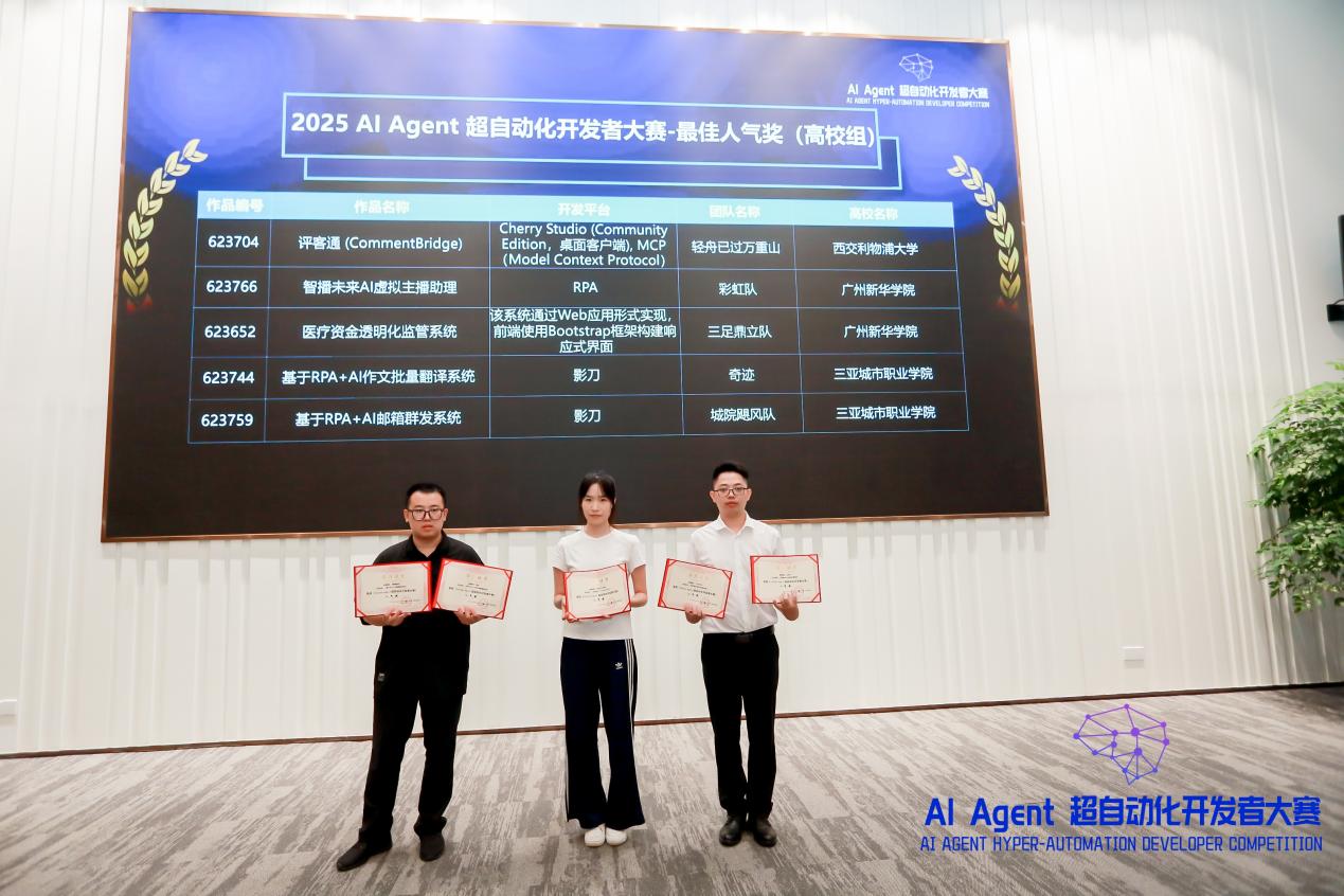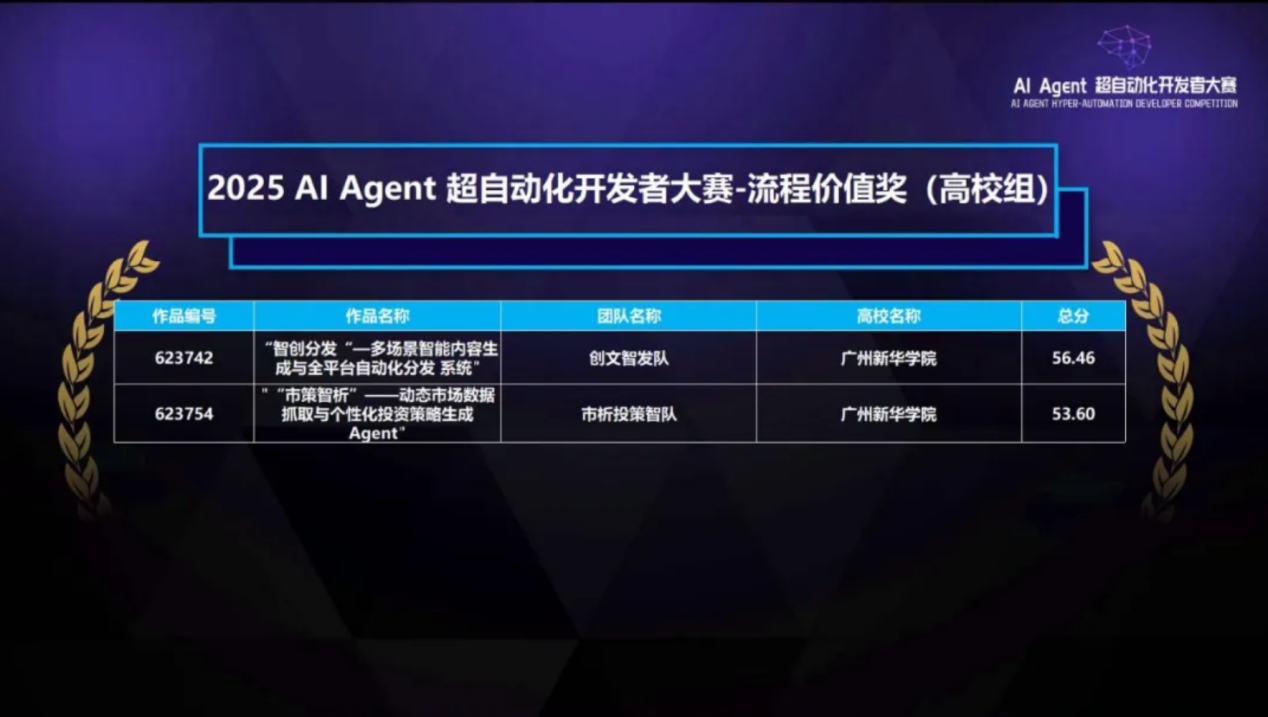 2025年9月27日,历时4个月的2025 AI Agent超自动化开发者大赛全国决赛在苏州工业园区阳澄数谷新建元数智湾G座圆满落幕。在带队老师兼项目主持人贺智聪老师统筹指导和熊俊宇老师提供技术支持下,永利yl23411学子与中兴通讯(企业组特等奖获得单位)、中国人民财产保险等知名企业,及西交利物浦大学、华东师范大学(均为高校组钻石奖(第二名)获得单位)等高水平院校的参赛队伍同台竞技,最终从全国228支参赛队伍、74支晋级决赛队伍中脱颖而出,一举拿下11项大奖,其中包括高校组特等奖(第一名)、1项金奖(第三名)、2项银奖、1项铜奖、2项最佳人气奖、2项流程价值奖及2项流程设计奖,亮眼成绩充分彰显学校在“会计+AI超自动化”交叉领域的实践教学成果与复合型人才培养硬实力。 图1 贺智聪老师和评委老师特等奖颁奖现场合影 本次大赛以“开发向新,智创未来”为主题,响应国家数字经济发展与“人工智能+”行动计划号召,由RPA中国、AIGC开放社区主办,算泥社区联合主办,苏州市金融科技协会指导,苏州工业园区大数据协会、硅创社等单位协办,容智信息、金智维提供支持,吸引了全国1102名开发者组队参赛,赛事评审由19位独立于厂商和参赛队伍的第三方行业专家、研究员及高校教授组成评审团,采用“盲评打分+复核确认”流程确保公平权威,高规格配置与激烈竞争凸显赛事行业含金量。 图2 “新华百事通”小组荣获(高校组)金奖 备赛与决赛过程中,永利yl23411由贺智聪老师担任带队老师兼项目主持人,全程统筹方案选题、团队组建与备赛推进,从会计场景需求拆解到方案实用性打磨层层把关;熊俊宇老师提供技术支持,协助解决技术架构搭建与落地细节优化问题。参赛学子凭借“5分钟作品路演+5分钟答辩”的清晰逻辑、扎实技术呈现,以及对会计核心场景的深刻理解——将AI Agent技术融入财务报表自动生成、报销流程智能审核、会计风险预警等业务,实现会计超自动化革新,最终赢得评审团高度认可。 图3 三足鼎立队与彩虹队荣获(高校组)最佳人气奖 此次获奖不仅是对新华学院参赛师生努力的肯定,更是学校深化“会计+AI”交叉学科建设、推进实践教学改革的重要成果。未来,学校将继续以这类高水平赛事为纽带,依托专业教师团队引领,鼓励更多学子投身会计数字化创新领域,培养更多适配行业智能化发展的复合型人才,为会计行业超自动化升级贡献“新华力量”。 「2025 AI Agent 超自动化开发者大赛」高校组永利yl23411其他获奖名单如下: 永利yl23411办公室供稿 图/贺智聪 文/陈辉龙 初审/冯春燕 复审/李安兰 终审/吴翔 2025/9/30