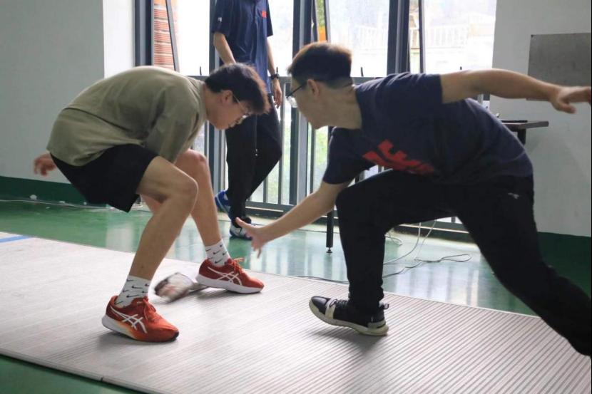 随后,在指导老师的带领下,同学们进行了热身训练,并开始“抢手套”热身小游戏,同学们运用击剑步伐,搭配自己的战术抢夺手套,逐渐掌握了击剑步伐的要领。
