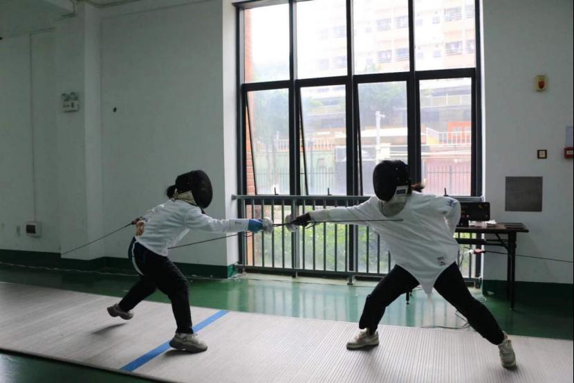 经过前面的学习,教练再向同学们讲解击剑如何有效得分、如何防守等注意事项,同学们对击剑的对战有了更加深入的了解,随后同学们开始穿上击剑服,进行击剑实战。